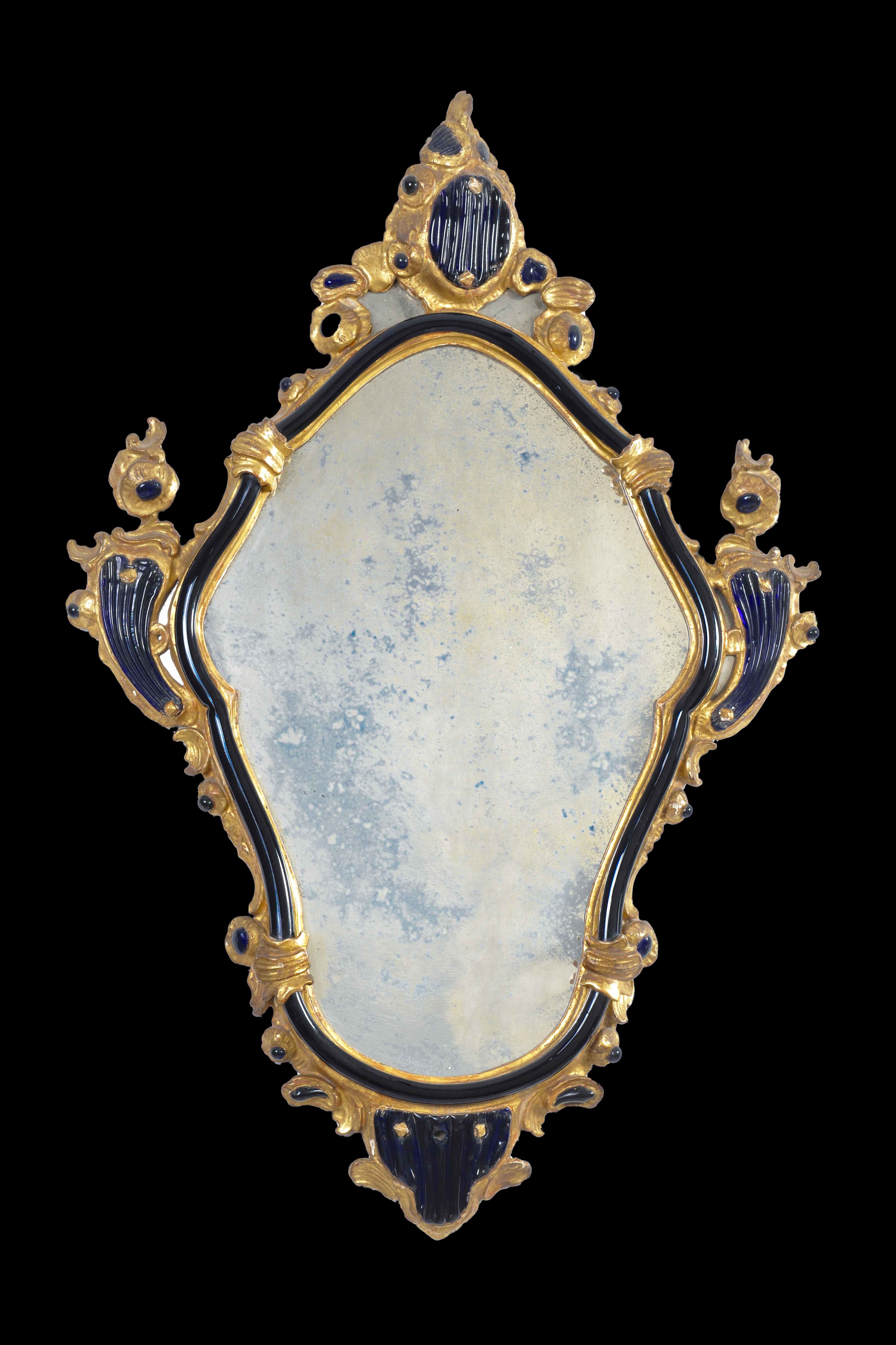 Coppia di appliques in legno intagliato e dorato , flessuosamente sagomata , è percorsa da inserti bleu cobalto in vetro e da raffinati intagli floreali che vanno ad intrecciarsi fino a concludersi in una piccola cimasa.