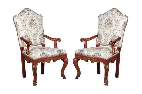 Poltrone in coppia in legno intagliato e laccato a fondo rosso . Ampio schienale imbottito e seduta sagomata dal pregevole andamento del grembiale su sostegni curvati.