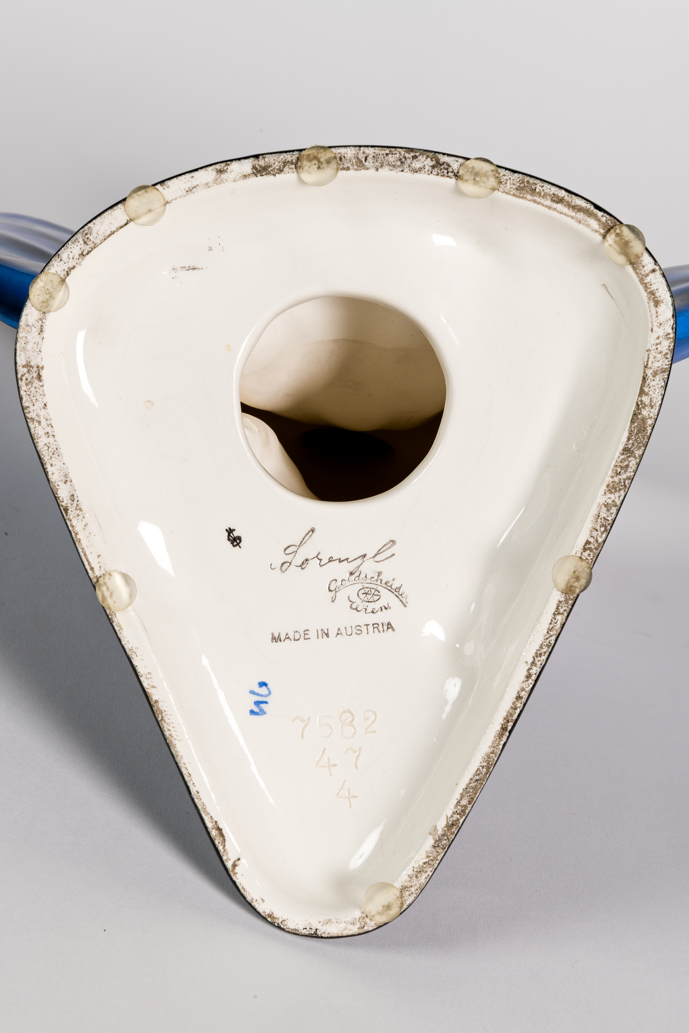 Magnifica scultura in ceramica policroma che incarna perfettamente l'estetica Art Dèco degli anni '20 e '30. La manifattura Goldscheider, fondata a Vienna da Friedrich Goldscheider, è celebre per aver collaborato con i migliori scultori dell'epoca tra cui Josef Lorenzl per quest' opera. Scultura in ceramica finemente modellata e dipinta a mano sottovetrina. L'opera raffigura una ballerina in una posa dinamica e teatrale, tipica delle riviste di varietà del periodo.La figura femminile è colta nel momento in cui solleva i lembi della sua ampia gonna, creando una scenografica forma a ventaglio che incornicia il corpo.Il blu intenso smaltato, con decorazioni floreali a contrasto, richiama le finiture lucide usate da Goldscheider negli anni '30.La posa con gamba in avanti e busto leggermente arcuato aggiunge un tocco di sensualità tipiche di Josef Lorenzl. La presenza di marchi così chiari e della firma di Lorenzl posiziona l'opera in una fascia alta del collezionismo Art Dèco, inoltre si tratta del modello 7582 uno dei " Top" .