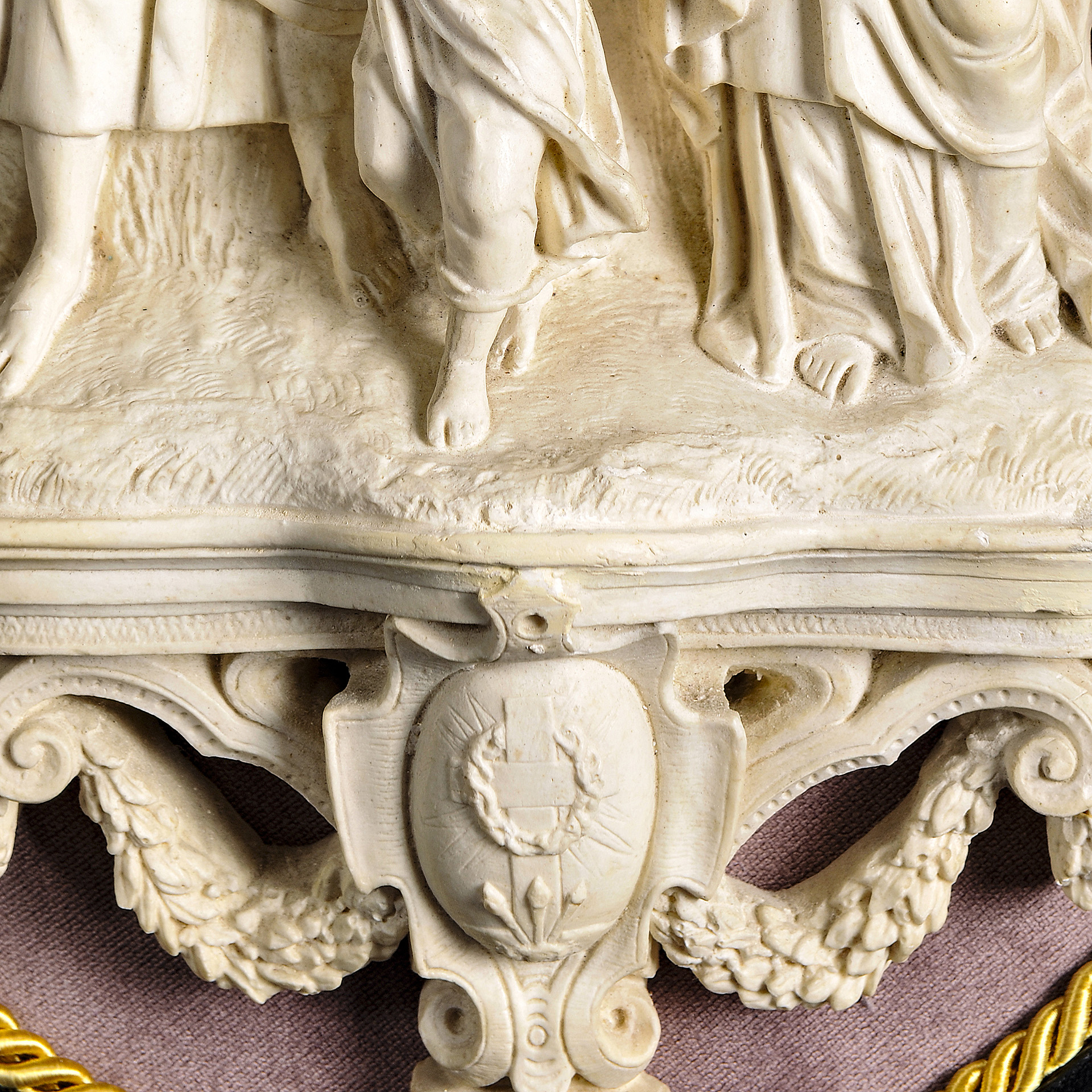 Bassorilievo finemente scolpito, entro cornice ovale in legno ebanizzato con bordo in cordoncino dorato.