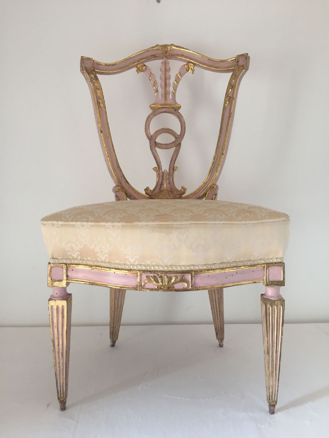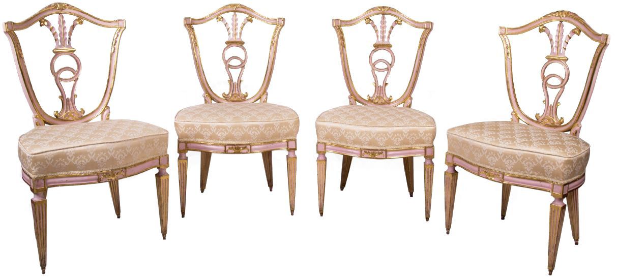 Quattro sedie in legno laccato e dorato. Gambe troncopiramidali.
