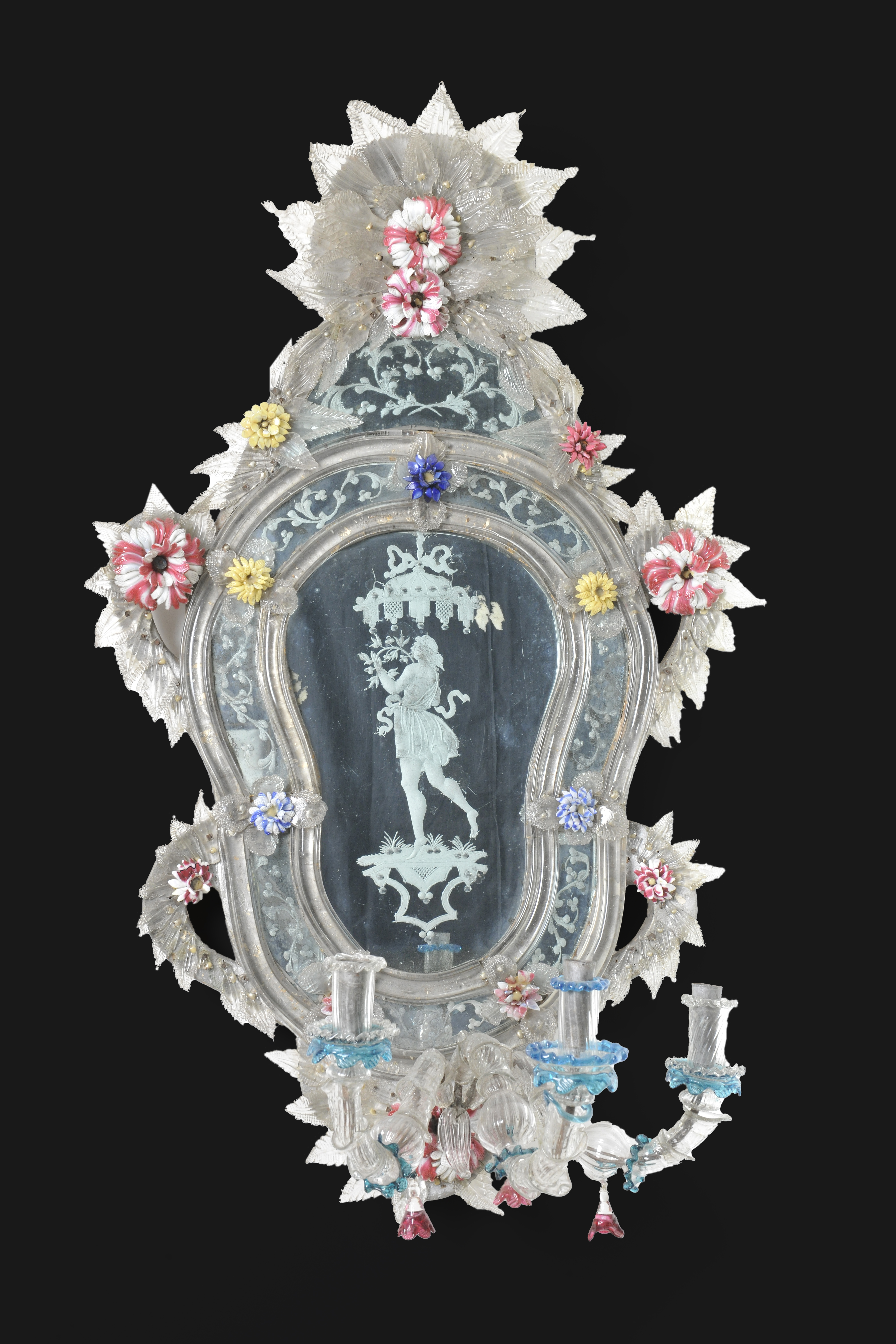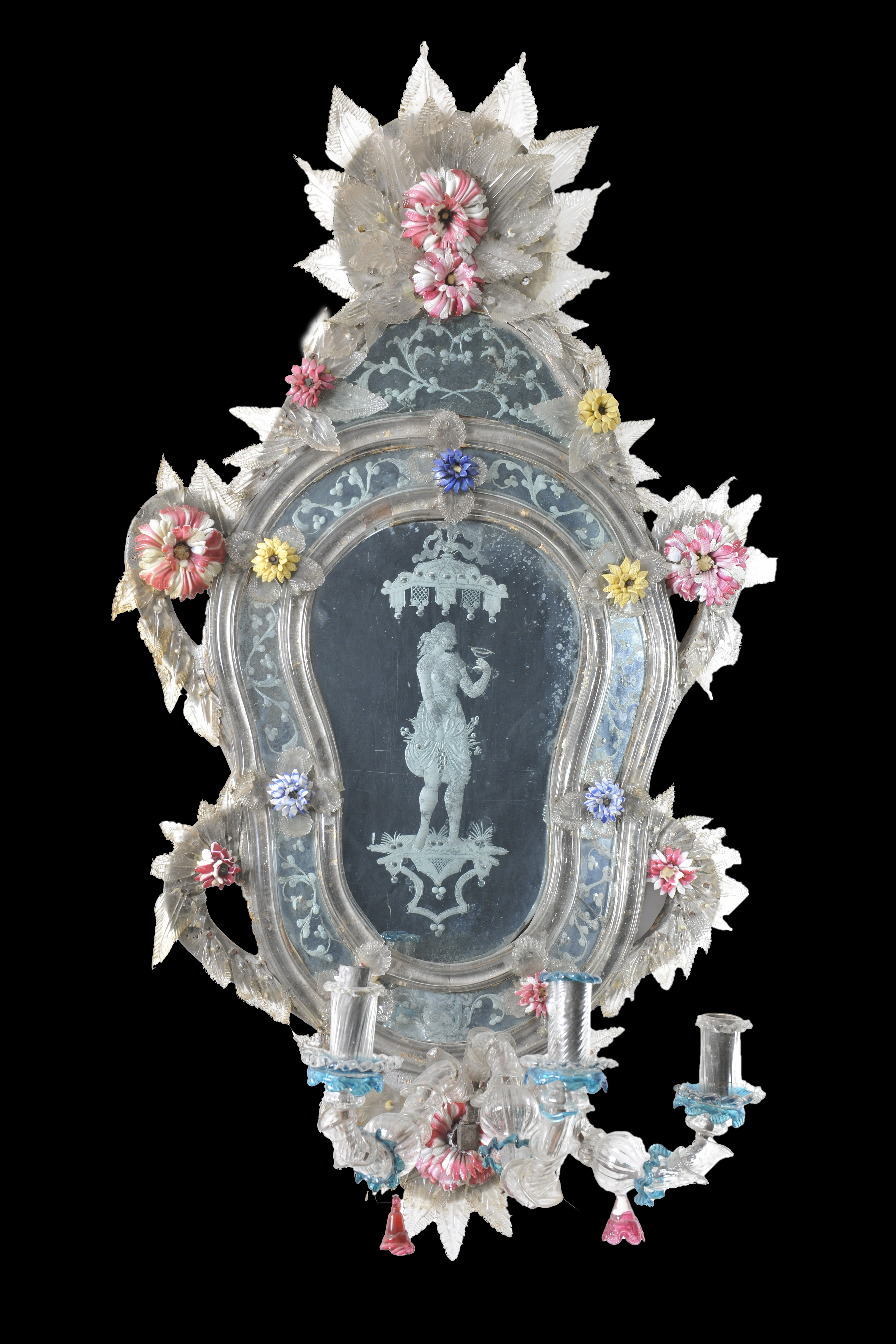 Rara coppia di specchiere veneziane con vetri policromi e specchi incisi, raffiguranti scene galanti di dama e cavaliere.