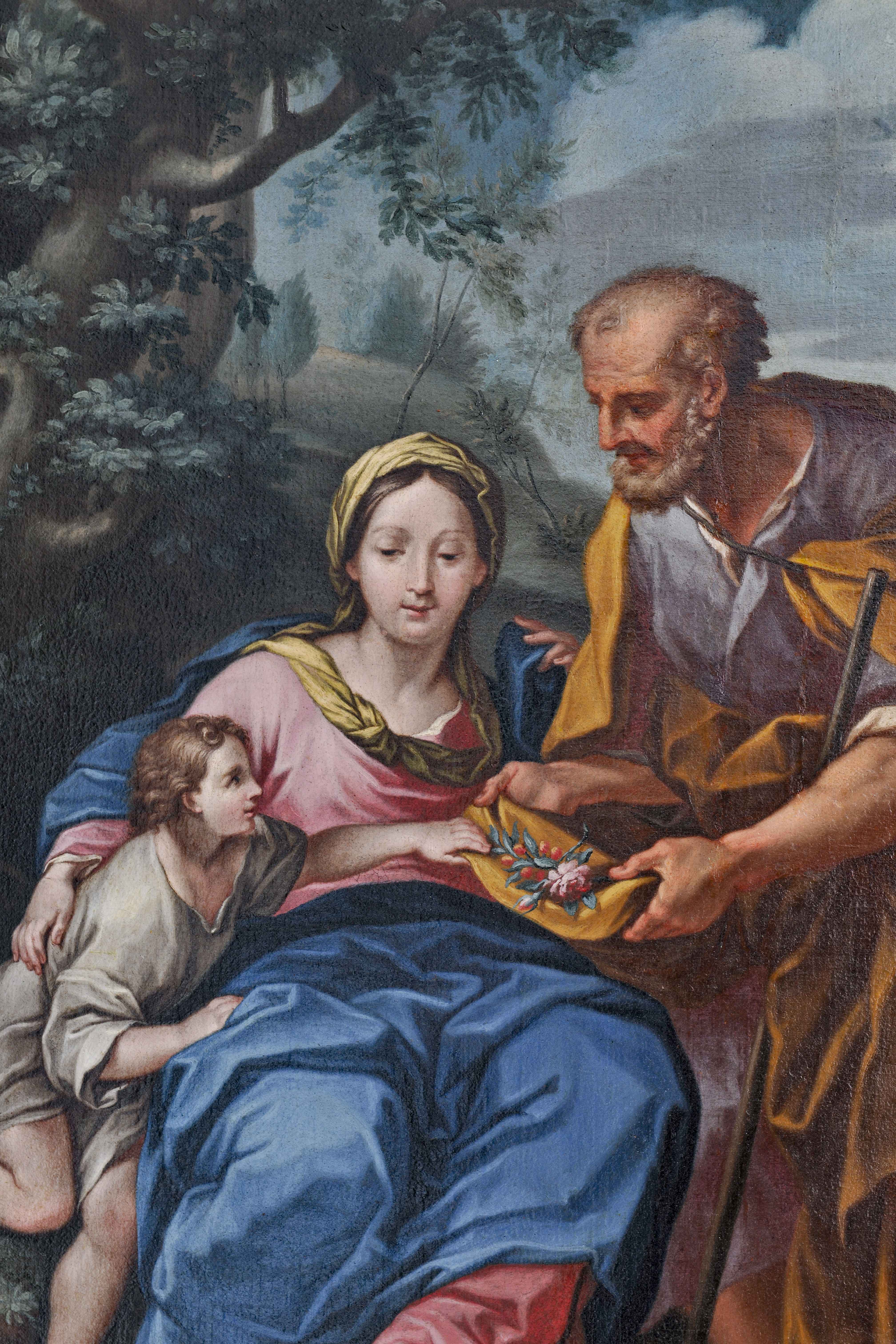 Il dipinto del '700 raffigura la Sacra Famiglia in un momento di riposo durante la fuga in Egitto.