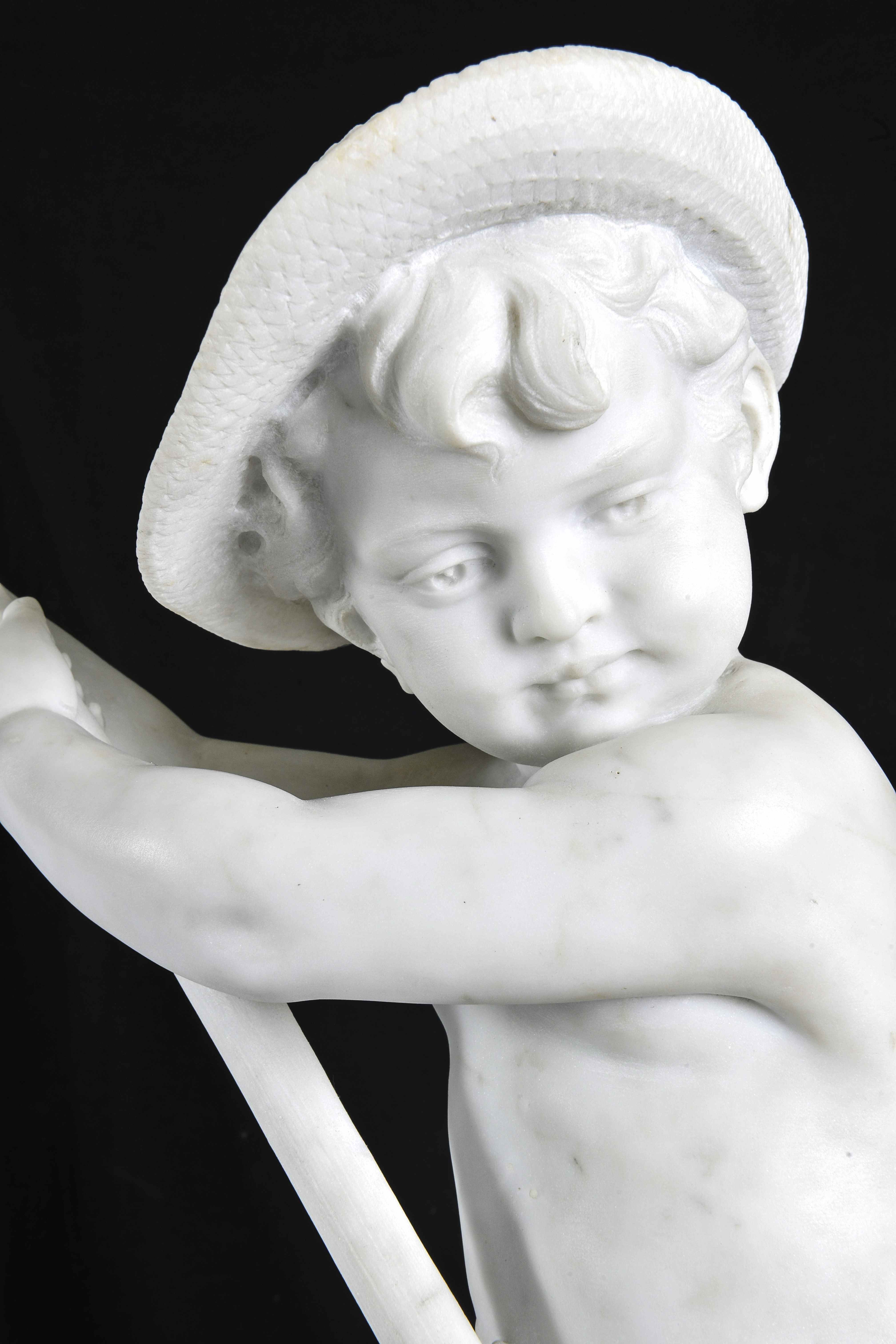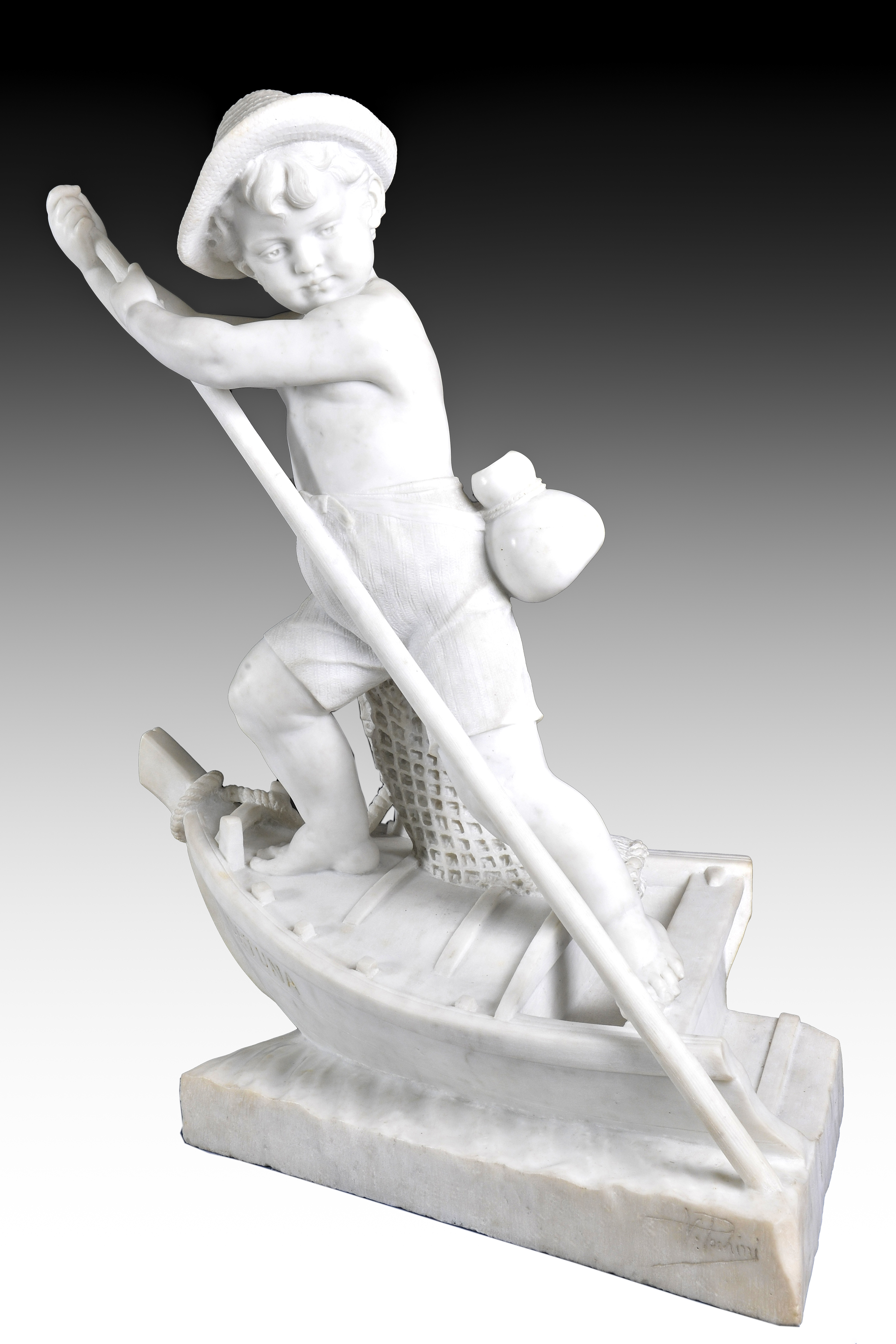 Gruppo scultoreo in marmo bianco statuario raffigurante un fanciullo pescatore nella sua piccola imbarcazione.