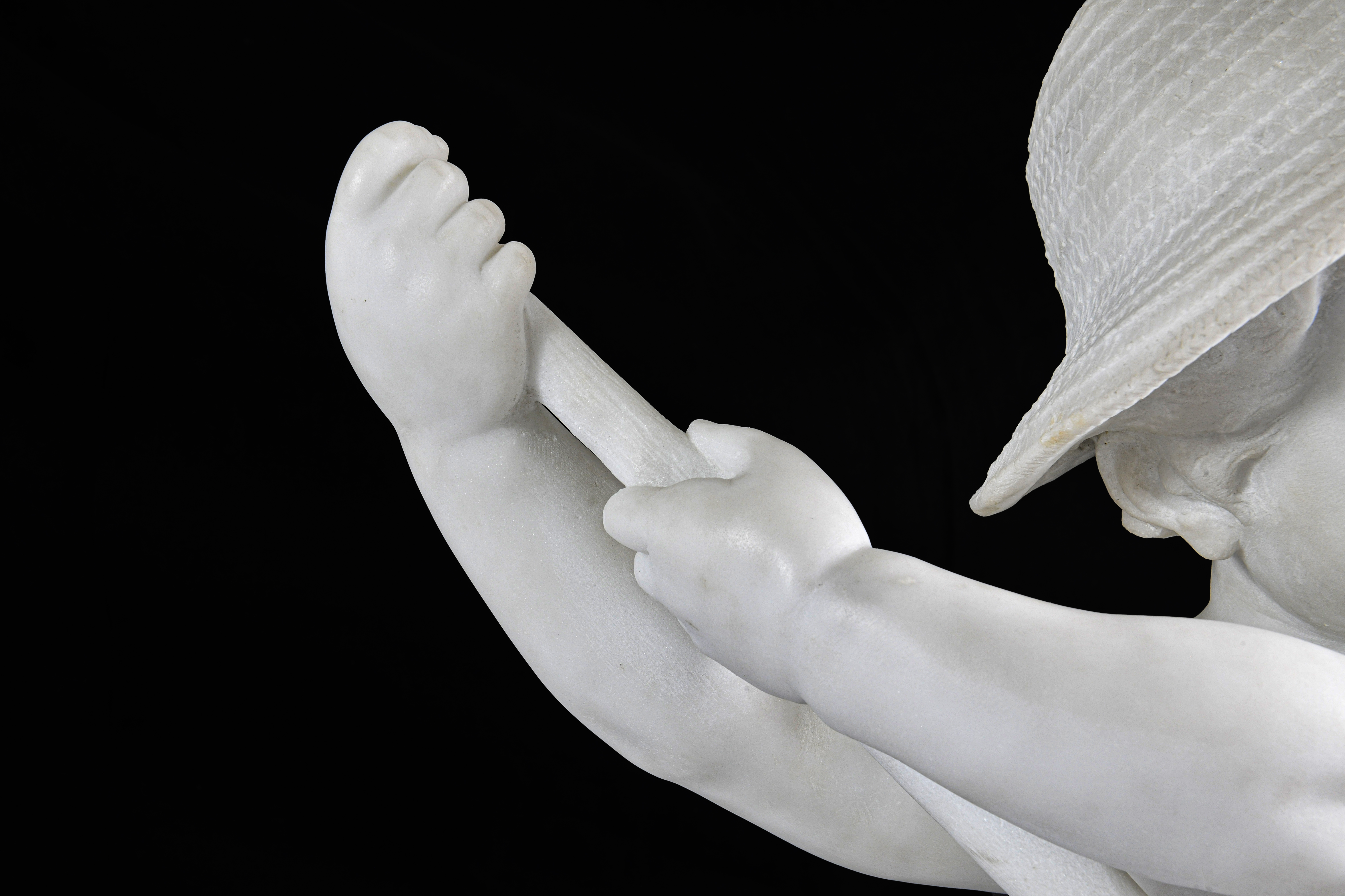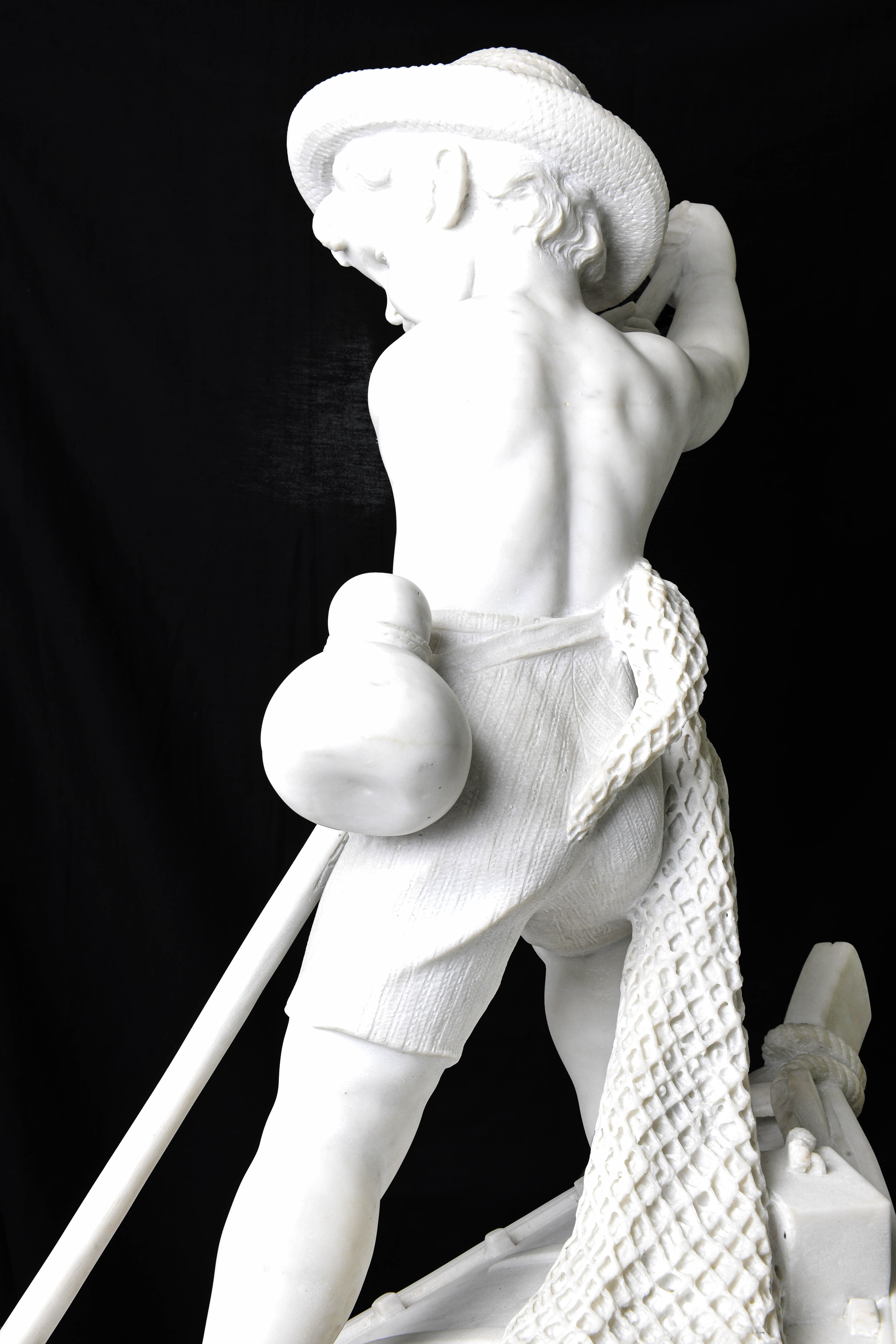 Dettagli: Indossa un cappello di paglia e pantaloncini semplici, scolpiti con notevole realismo. Sulla schiena porta una piccola sacca o fiasca. Ai suoi piedi, nella barca, si intravede una rete da pesca (nassa) finemente intagliata nel marmo. L'opera poggia su una base rettangolare. Il fanciullo è in piedi su una piccola imbarcazione, con la base dell'opera che suggerisce il moto ondoso dell'acqua. La finitura del marmo è liscia e lucida, esaltando la morbidezza delle carni del bambino.