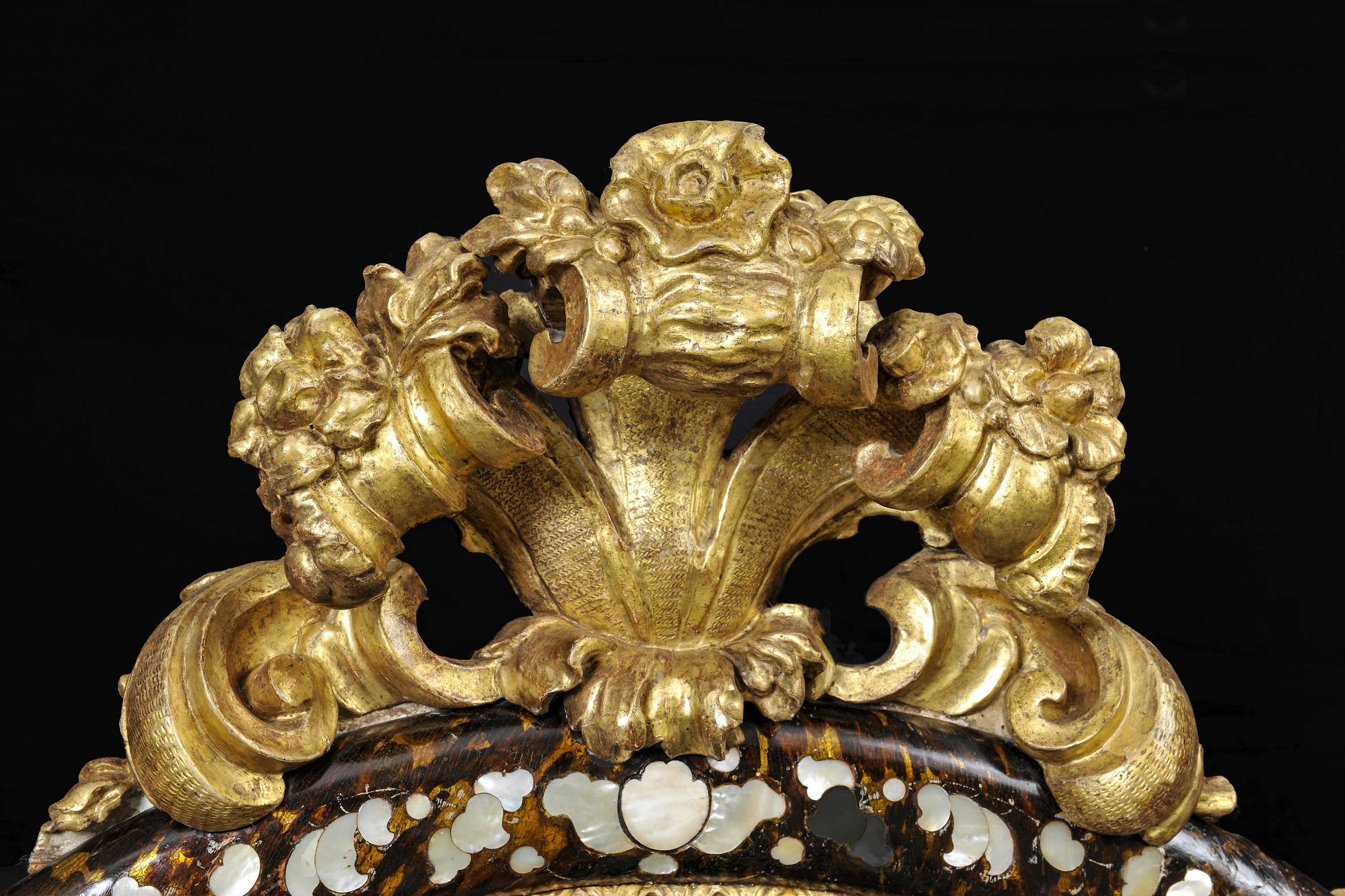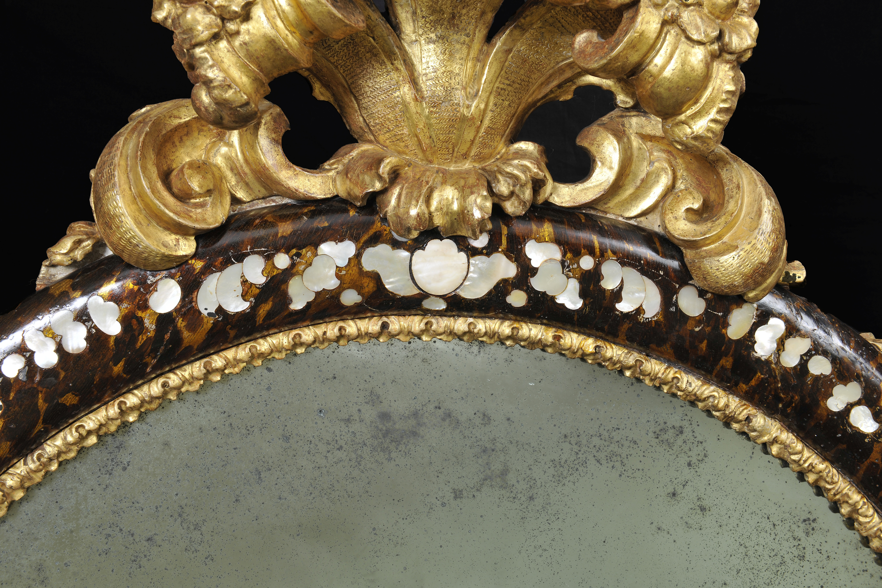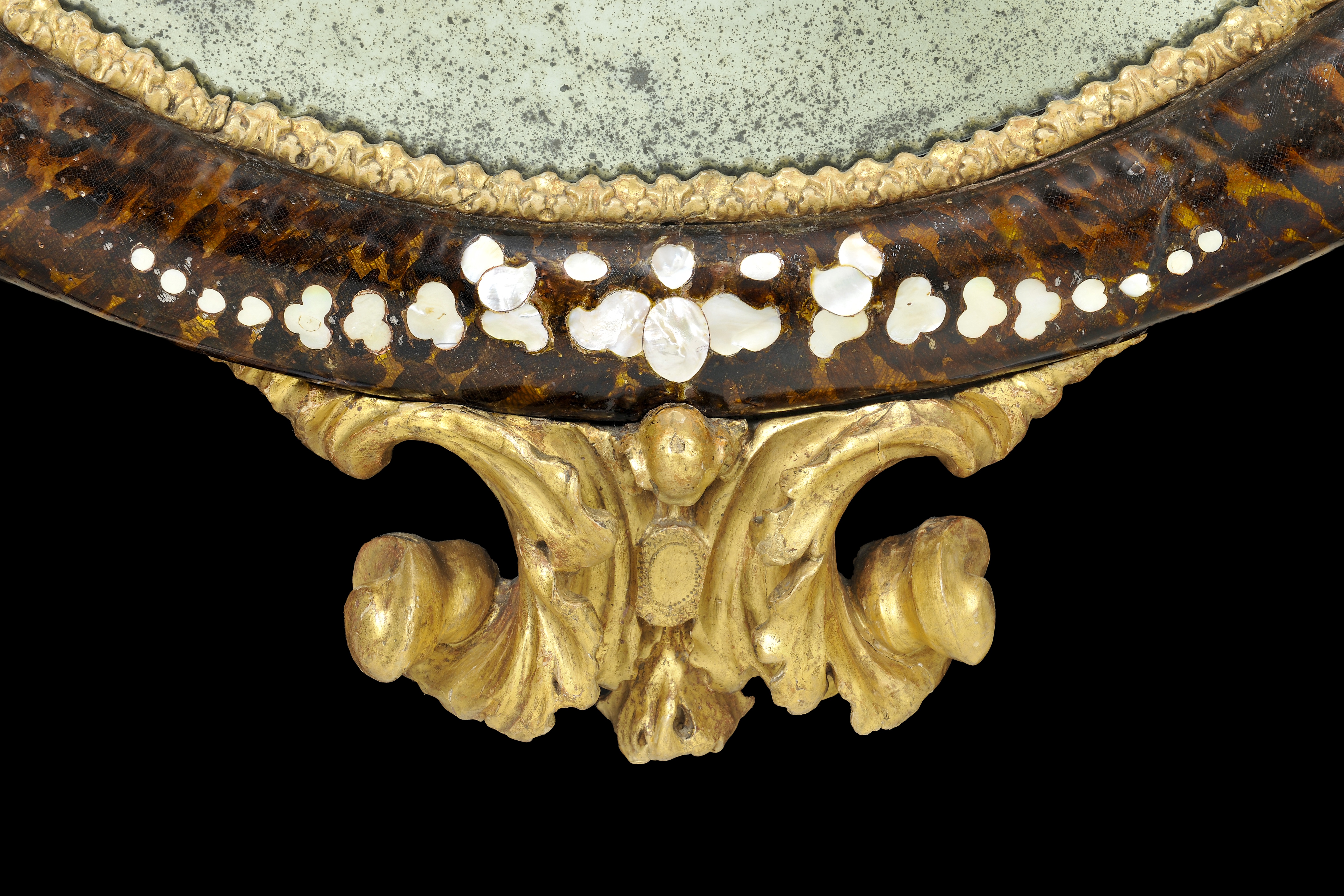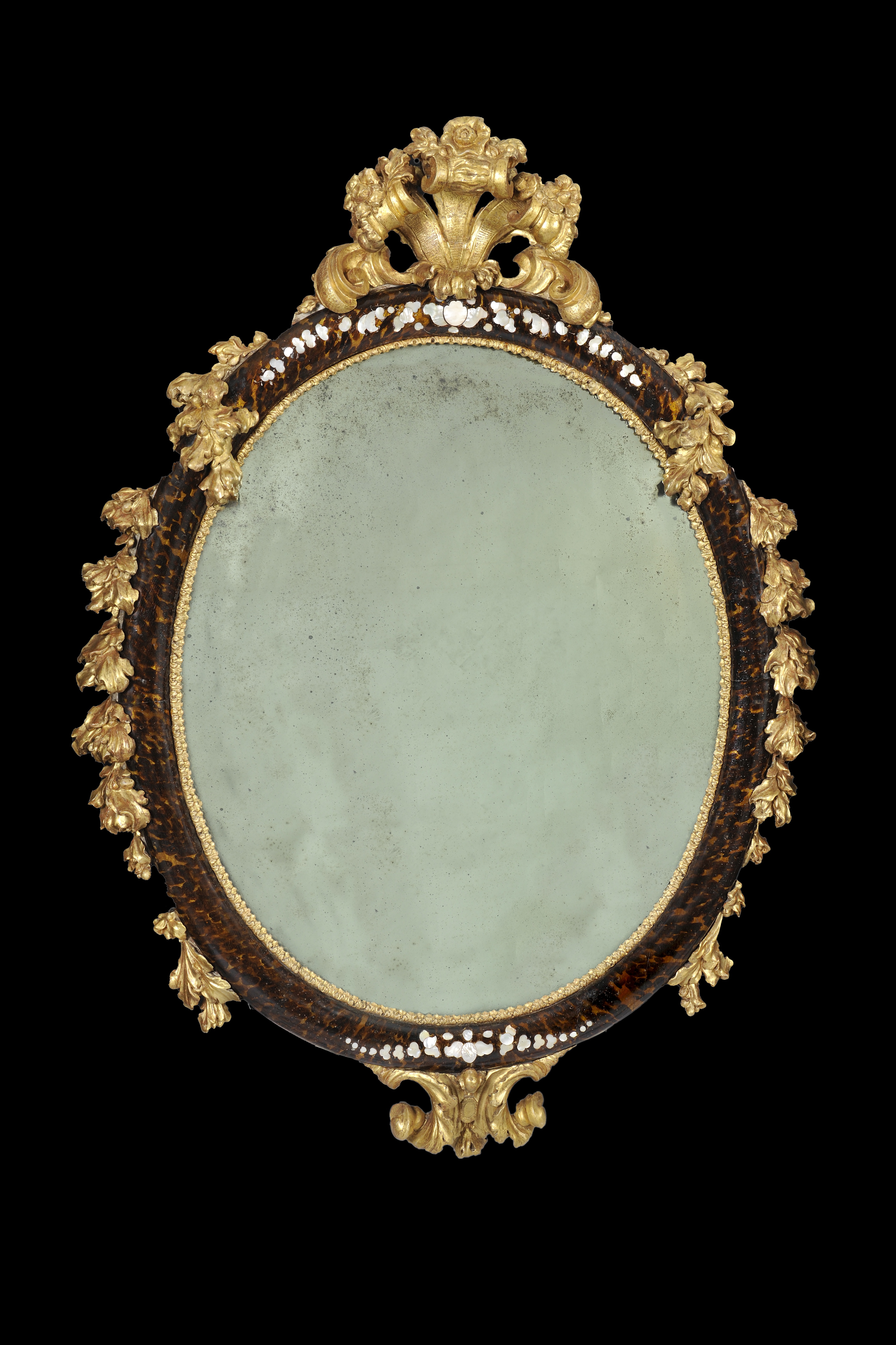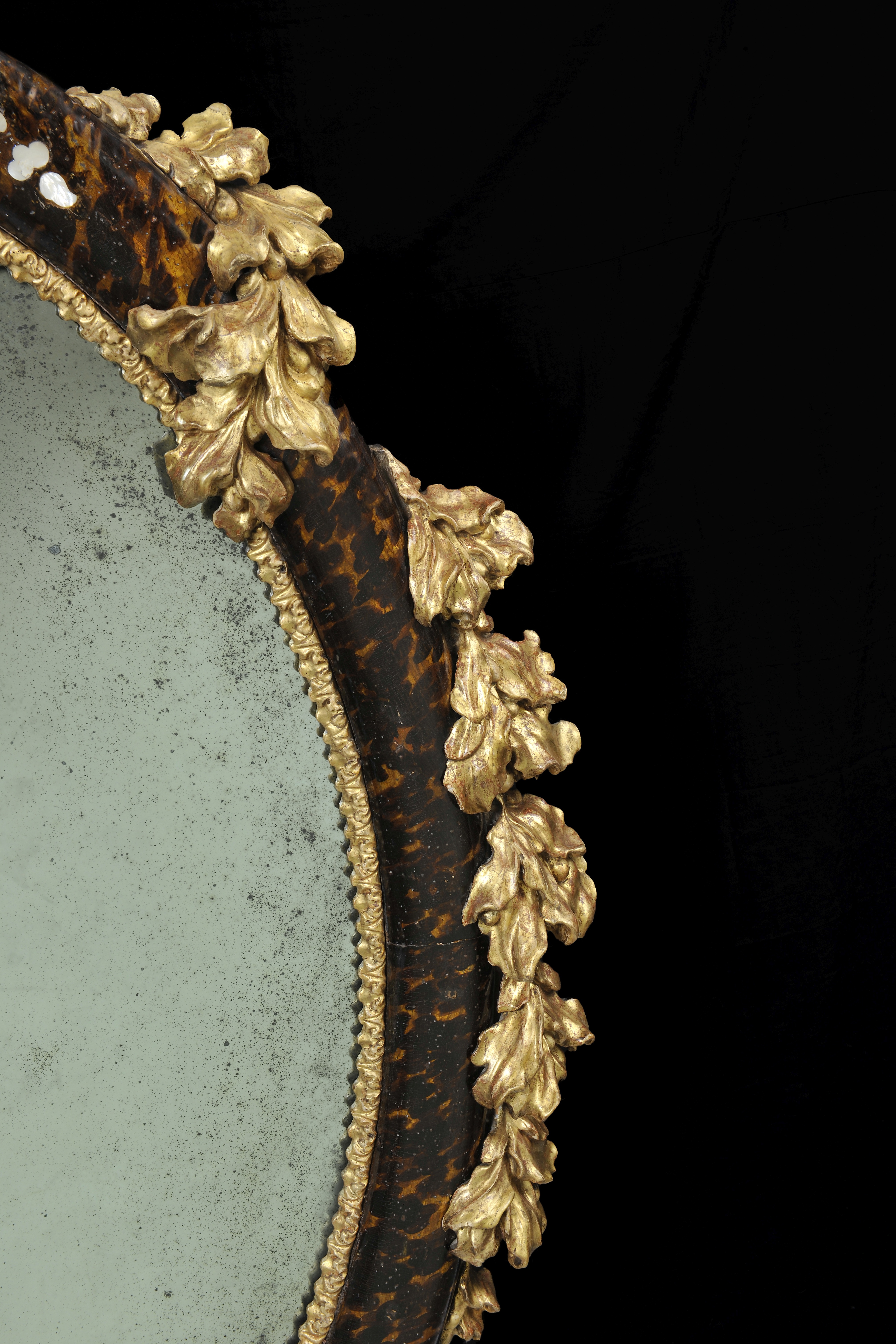 La preziosa Specchiera con intarsi in madreperla entro la cornice laccata e dorata con cimasa e pregi in volute sul fondo tartarugato è il raffinato connubio di lacca e Madreperla della città di Venezia. Lungo il bordo ovale della cornice si posano intagli intervallati scolpiti e dorati ad impreziosire la fascia bombata.