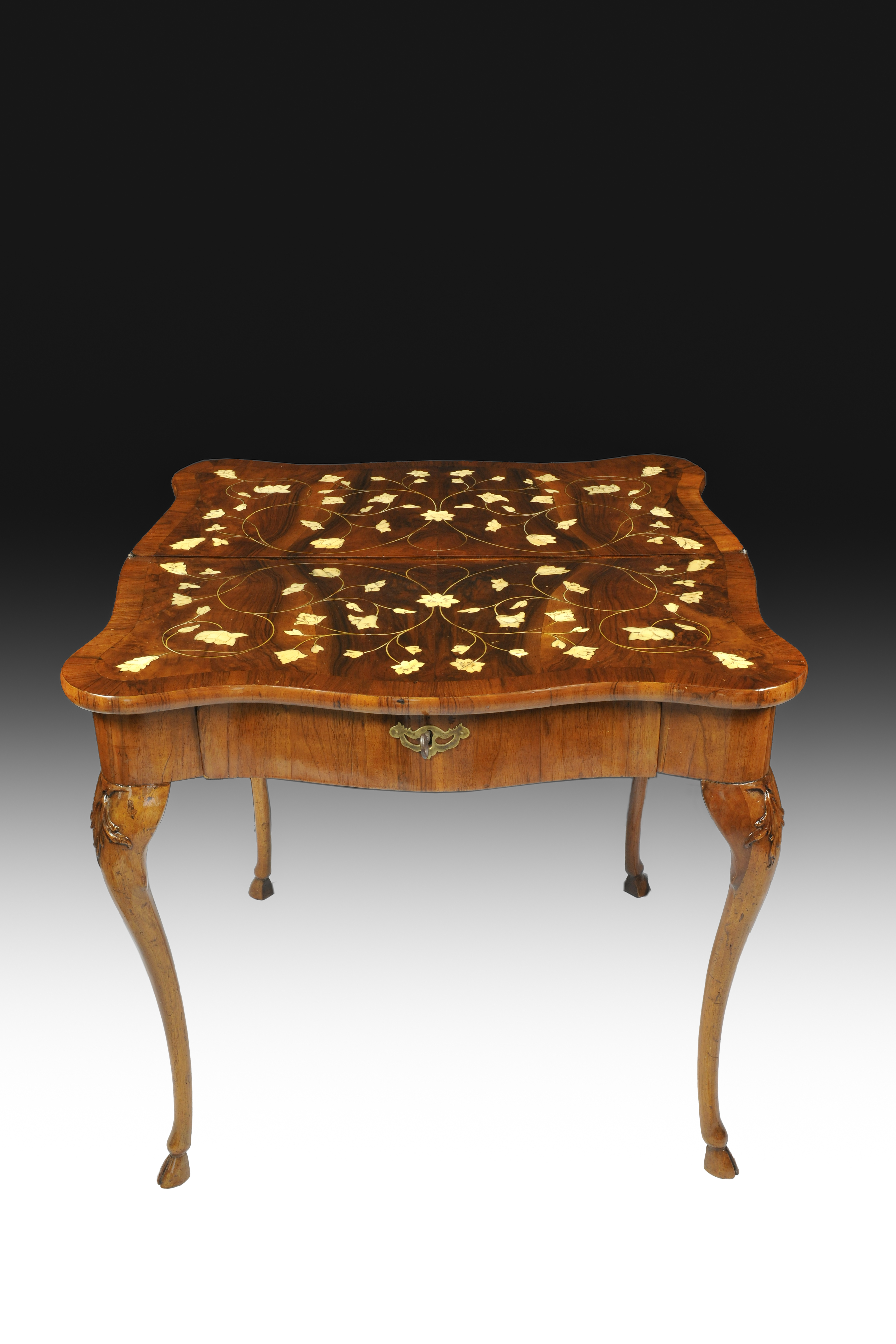 Il tavolino da gioco in legno di noce è caratterizzato da un doppio ripiano con eleganti e ricercati intarsi floreali in avorio. La fascia elegantemente lastronata e sagomata con inserito un piccolo cassetto poggia su sostegni ricurvi intagliati da decori fogliacei che terminano su piede caprino .