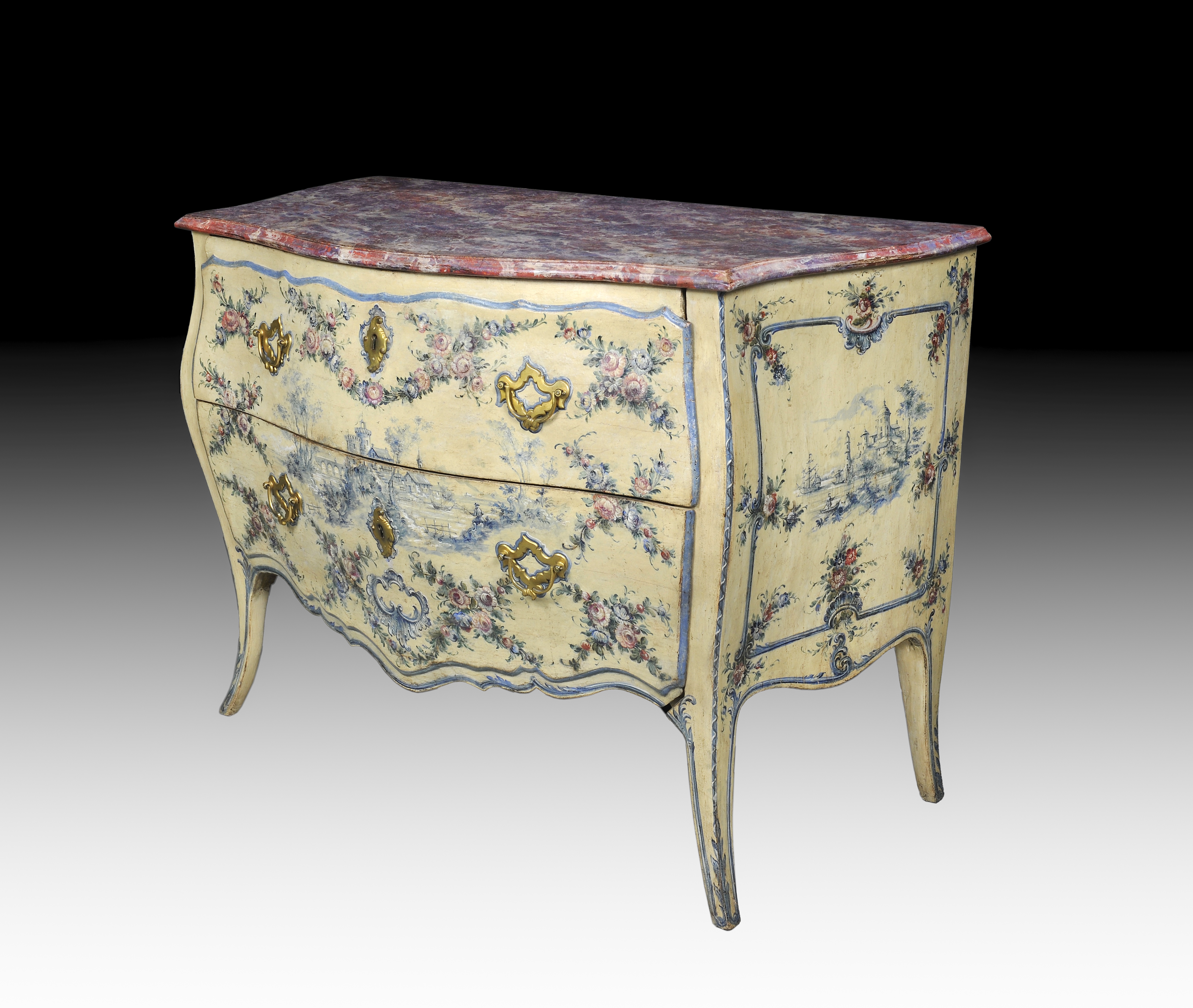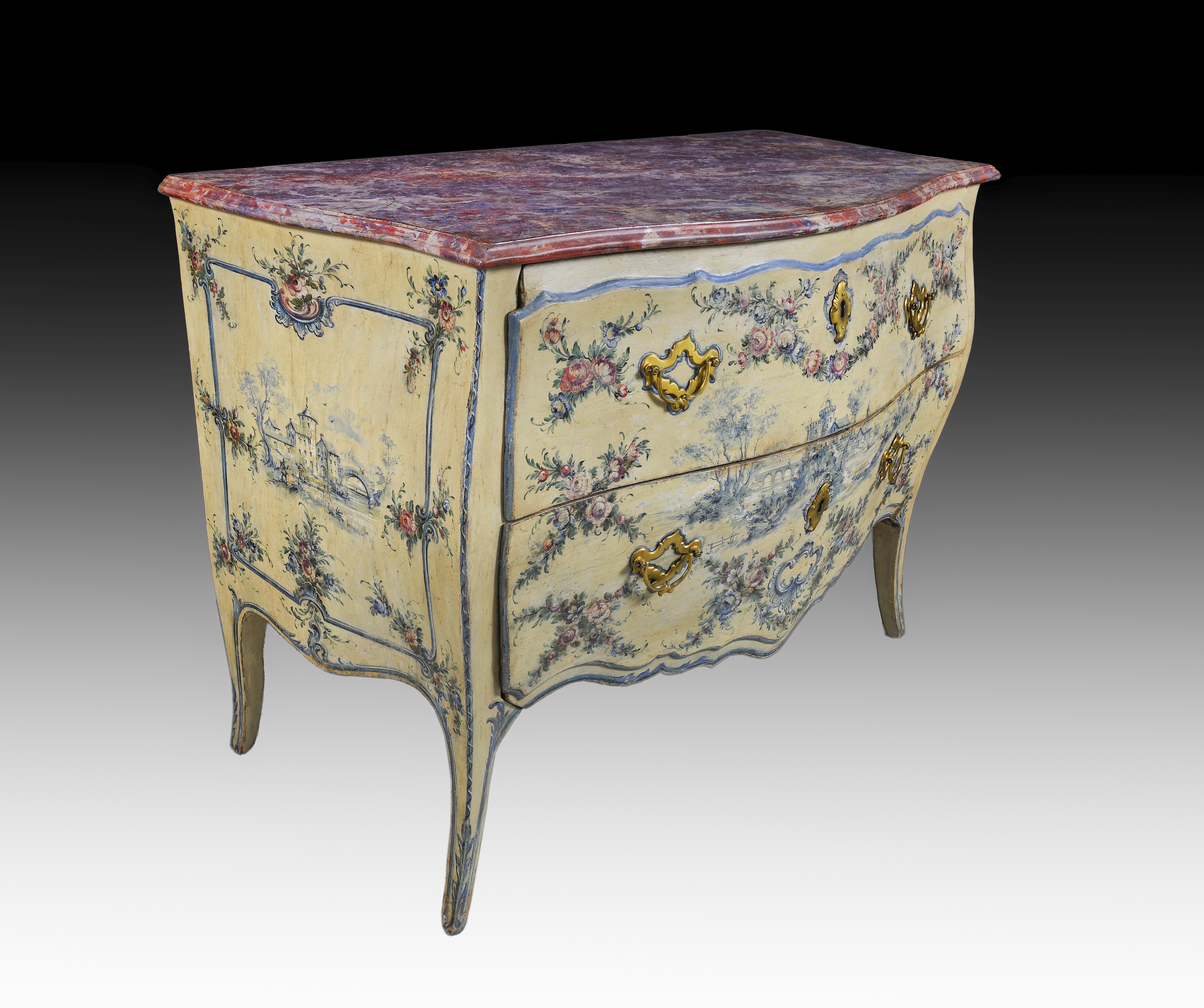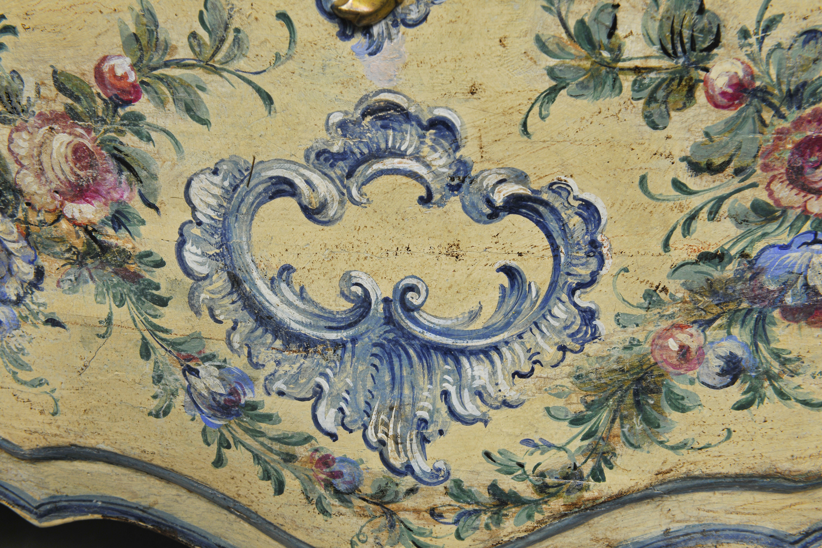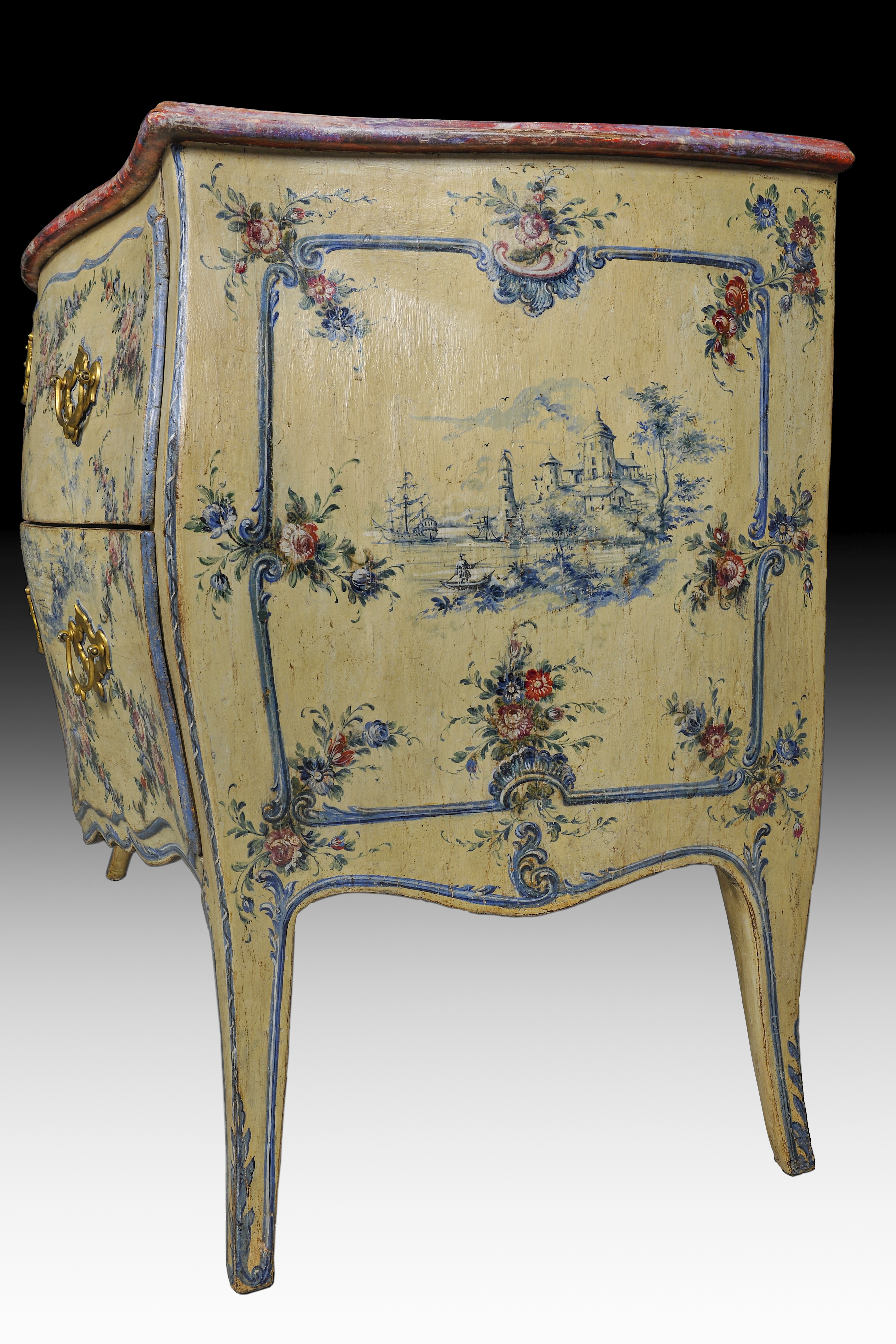 Il cassettone di provenienza genovese in legno dipinto in policromia di linea mossa e bombata sagomato sul fronte ed in entrambi i lati è sotteso da due cassetti decorati a motivo floreale con paesaggi arcaici raccordato da pendaglina mossa su quattro sostegni slanciati .