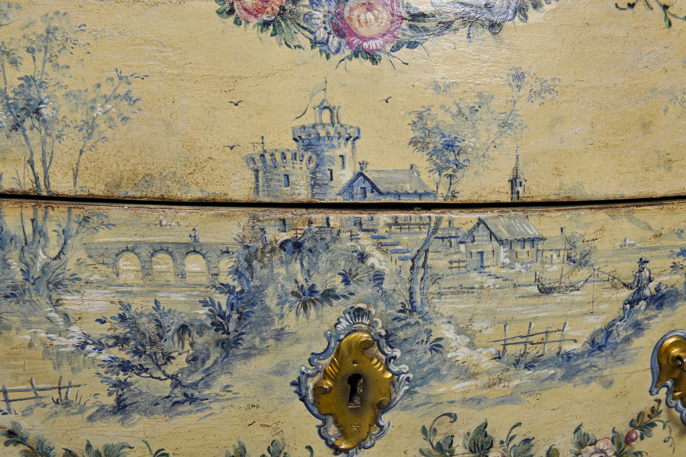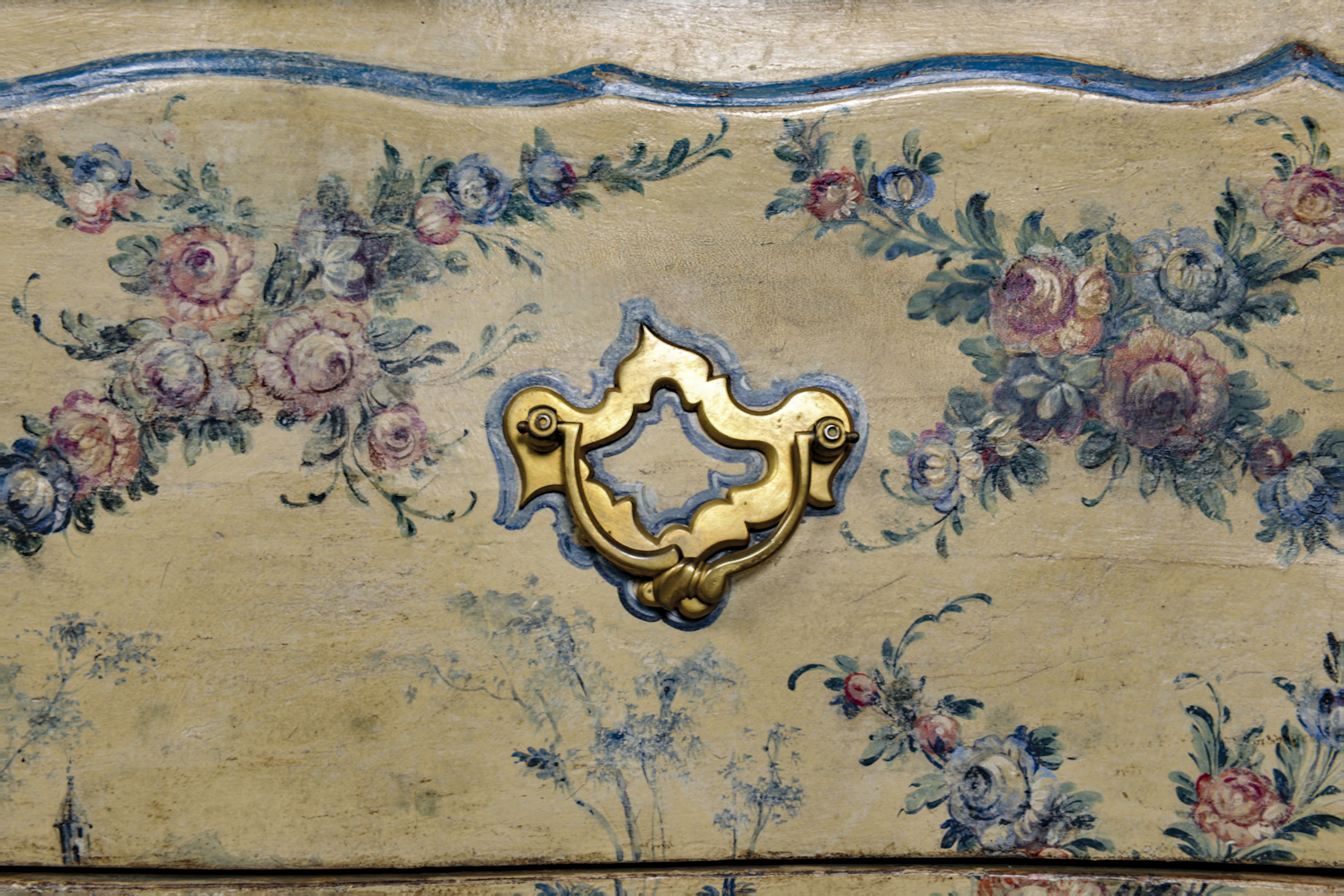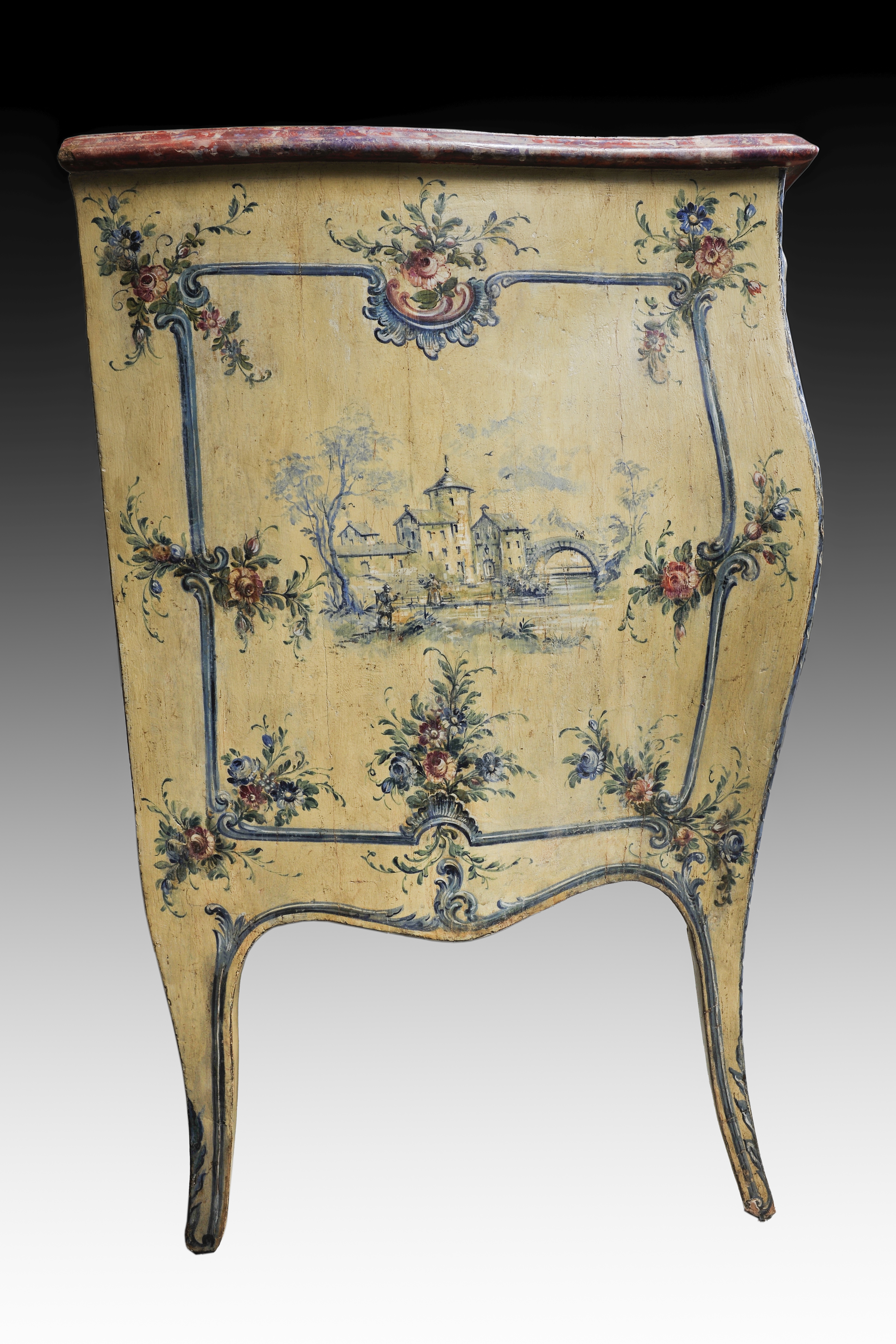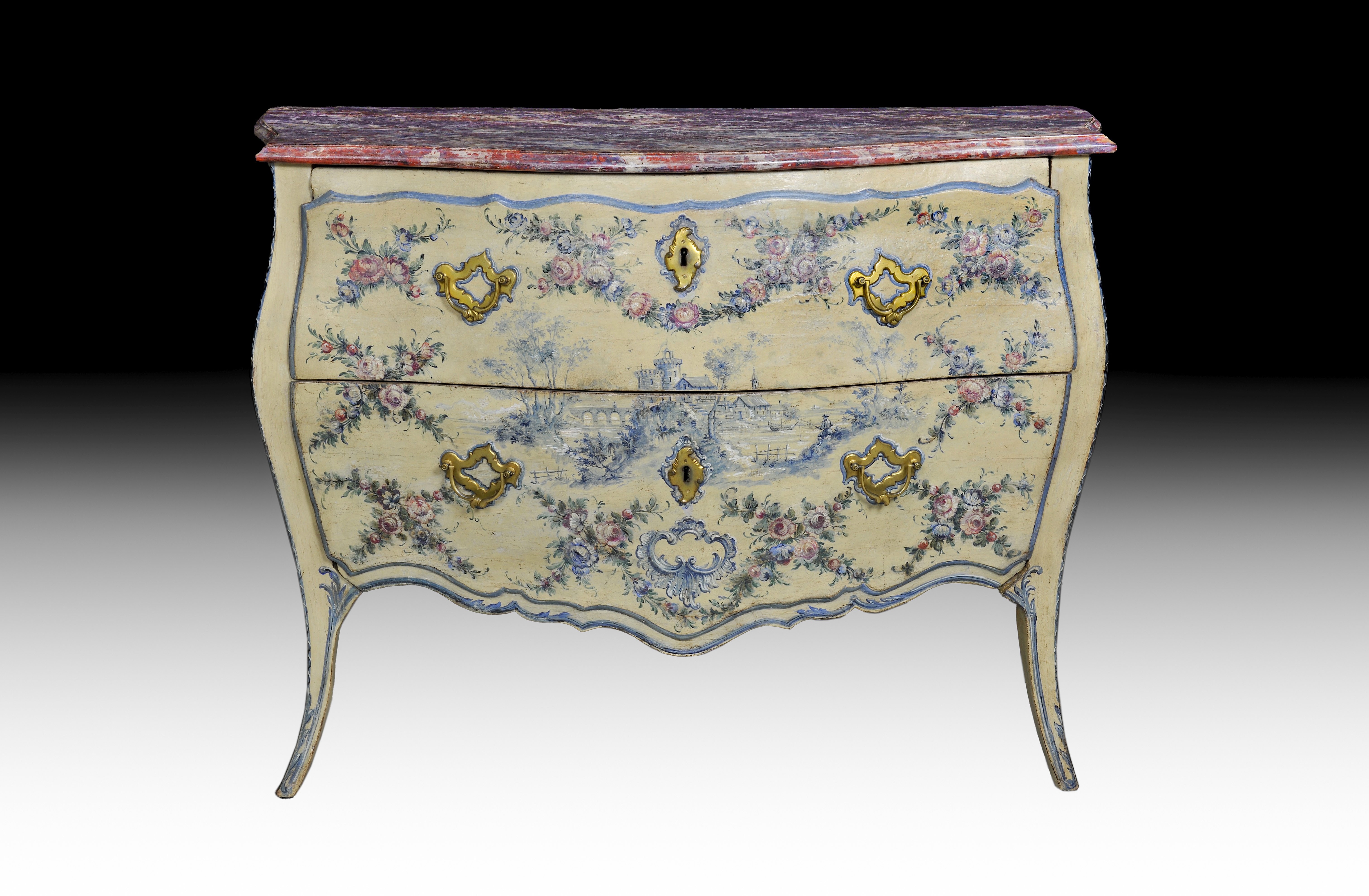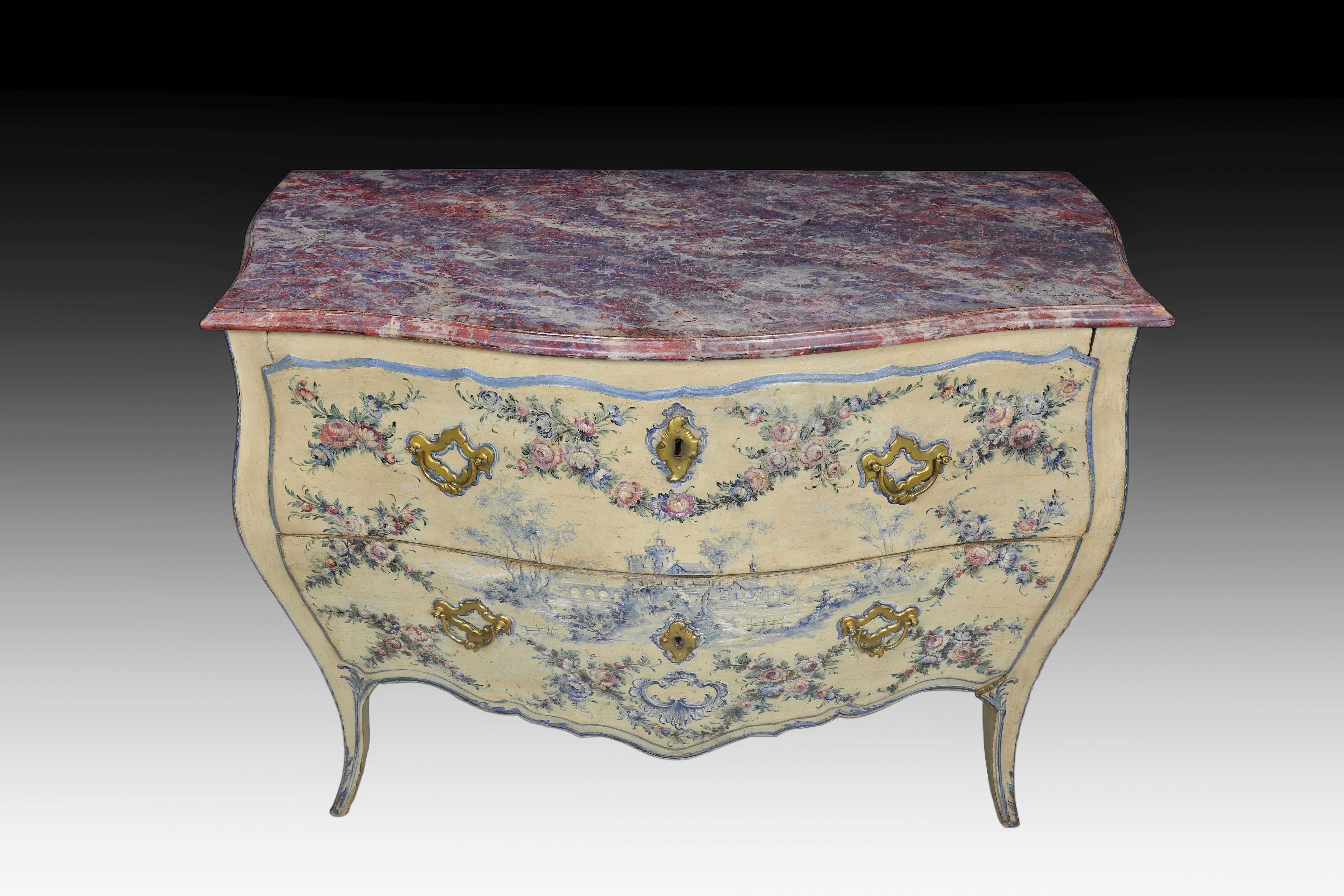 Il cassettone di provenienza genovese in legno dipinto in policromia di linea mossa e bombata sagomato sul fronte ed in entrambi i lati è sotteso da due cassetti decorati a motivo floreale con paesaggi arcaici raccordato da pendaglina mossa su quattro sostegni slanciati .