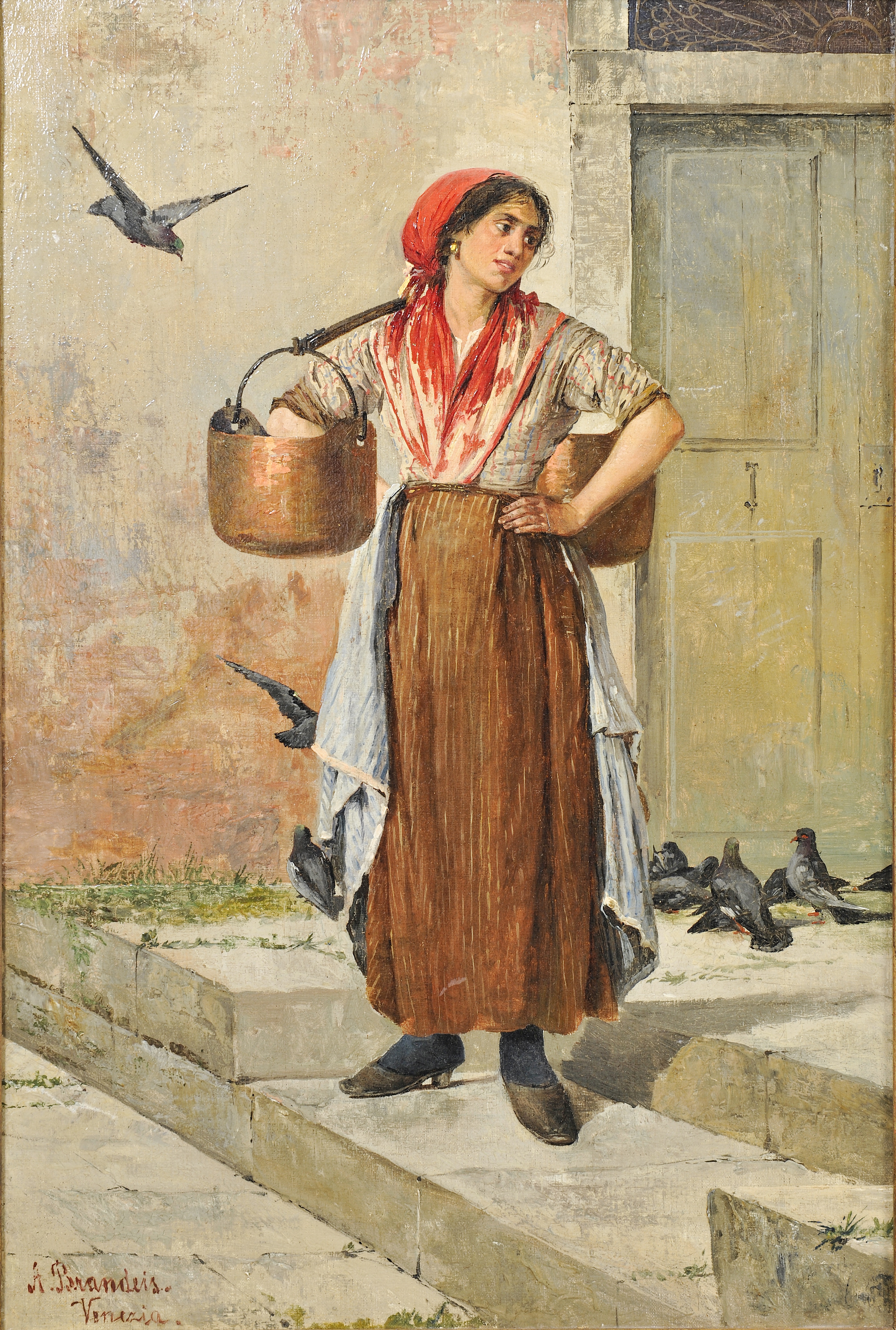 Antonietta Brandeis fu una delle prime donne a frequentare l'Accademia di Belle Arti di Venezia. Era celebre per le sue vedute urbane dettagliate di Venezia, Roma e Firenze, ma anche per queste scene di genere che ritraevano con affetto e realismo il popolo e la vita quotidiana, spesso con un'attenzione particolare alla luce e al colore. "La Popolana" è un esempio eccellente di questa produzione, dove il ritratto si fonde con la veduta di ambiente, offrendo uno spaccato autentico e poetico.
