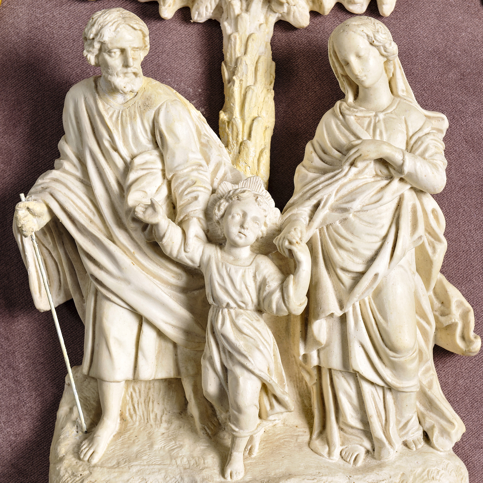 Ottima qualità d’intaglio, con panneggi morbidi e volumi ben modulati,montato su velluto rosa antico.Il gruppo rappresenta la Sacra Famiglia durante la fuga in Egitto: San Giuseppe, appoggiato al bastone, conduce per mano il piccolo Gesù, mentre la Vergine, avvolta in morbidi panneggi, volge verso di loro uno sguardo assorto. Sullo sfondo una palma, simbolo di purezza e di rifugio, definita con raffinata resa naturalistica.L’opera poggia su mensola scolpita a volute, decorata al centro da uno stemma inciso.Eccellente qualità di lavorazione, con dettagli minuti e superfici levigate che rivelano la maestria di un intagliatore attivo nella seconda metà del Settecento.