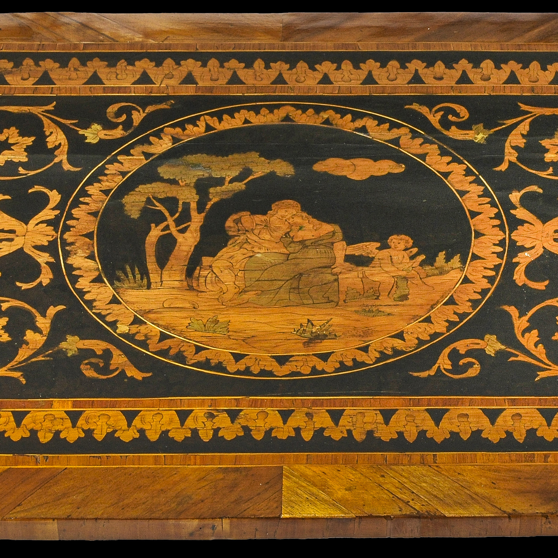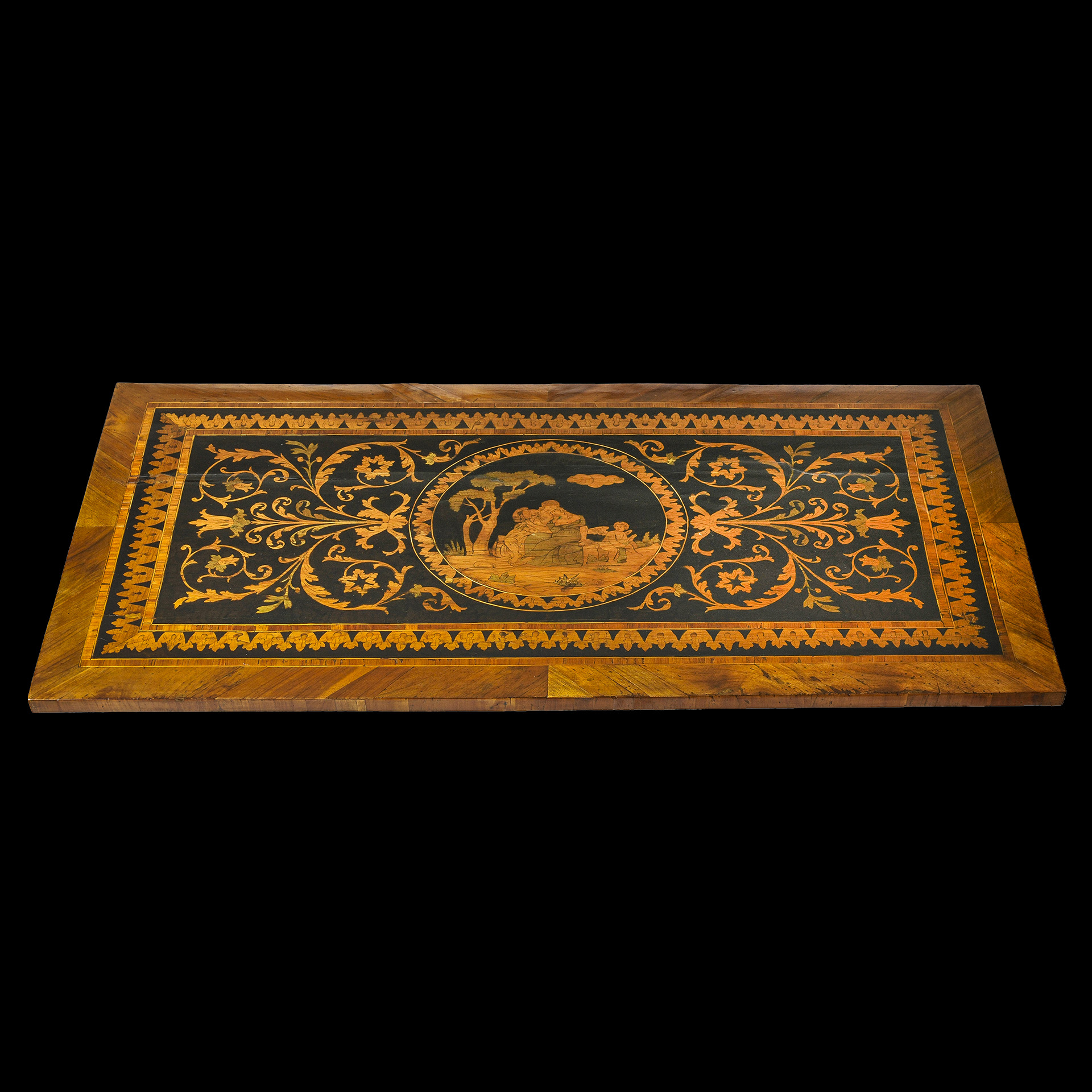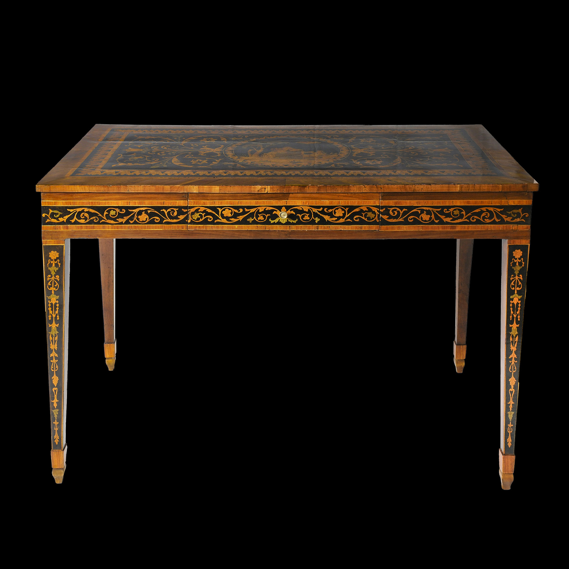 Scrittoio da centro dai canoni stilistici neoclassici , il piano intarsiato in varie essenze tra cui bois de rose , palissandro ed ulivo che presenta al centro un rosone con scena di figure innamorate e cupido che racchiude un insieme di tralci fioriti speculari. La fascia sottopiano ospita un cassetto percorso anch'esso a motivo floreale poggiante da sostegni tronco piramidali sui quali seguita l'abile intarsio.