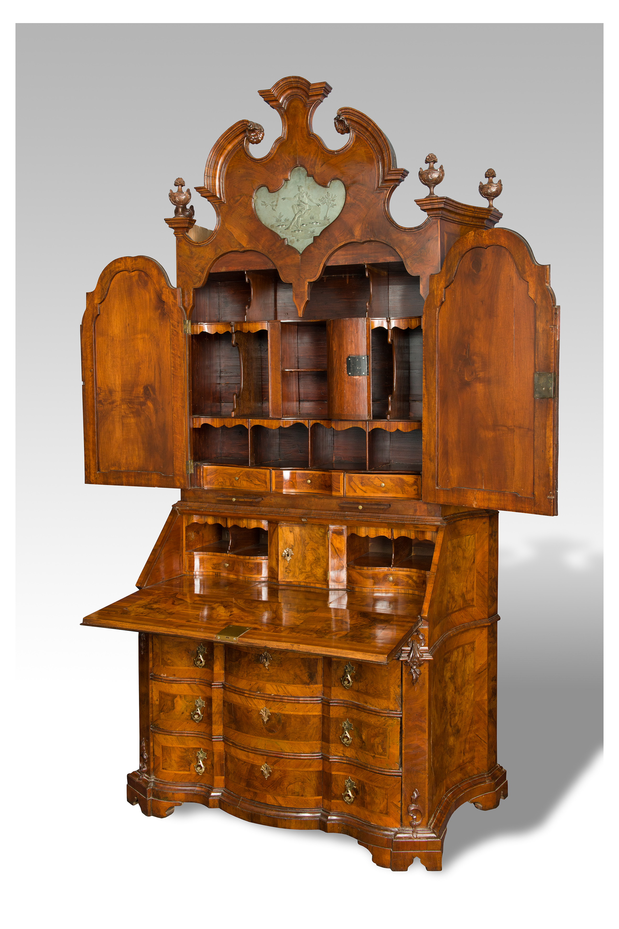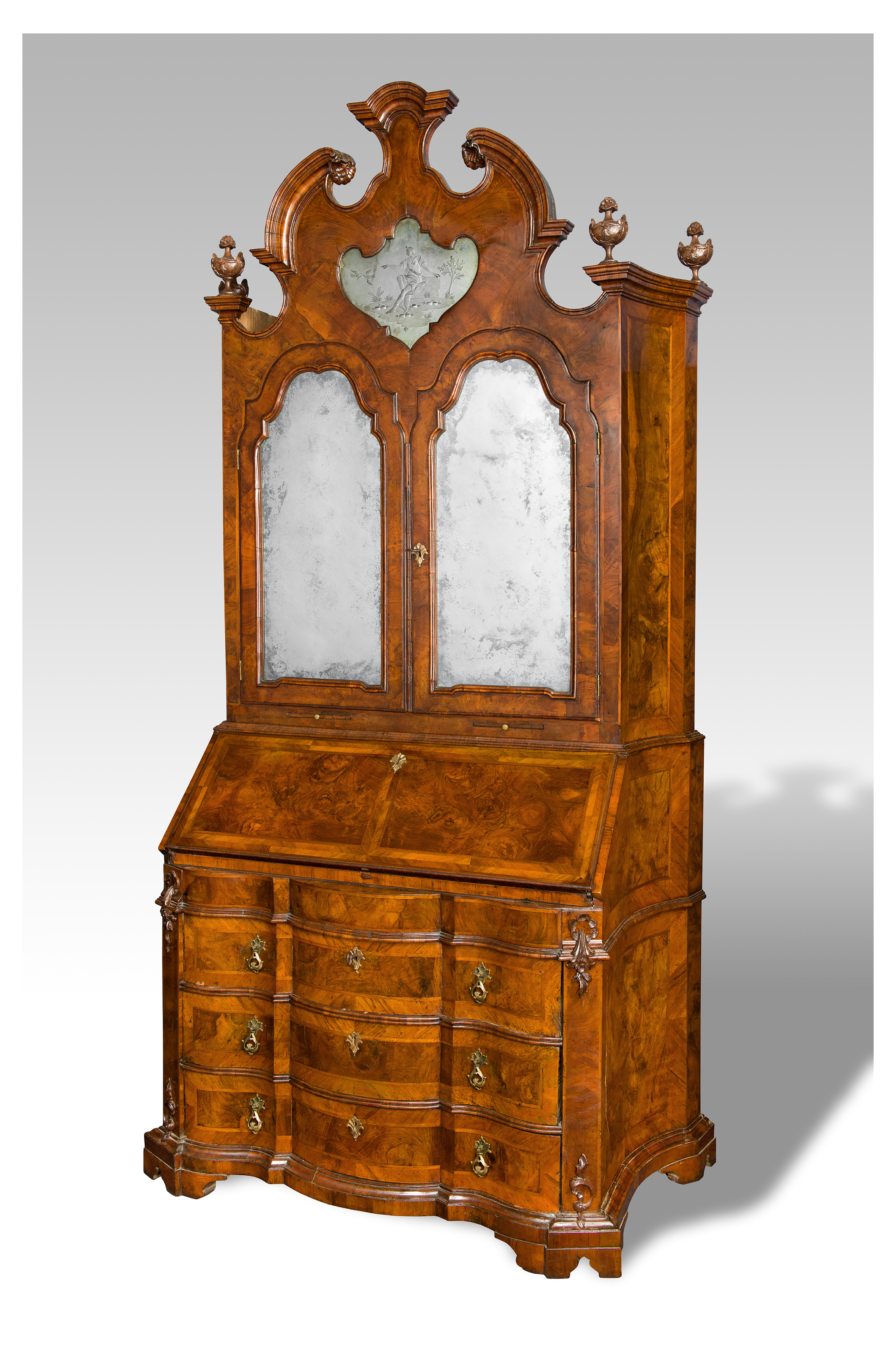 Trattasi di Bureau Trumeau lastronato in radica di noce sagomato sul fronte e sui lati ; fronte a tre ordini di cassetti con calatoia celante due cassettini e un antina ; alzata a due ante a specchio con parte superiore racchiusa da timpano a linea spezzata centrata da uno specchio raffigurante figura mitologica.